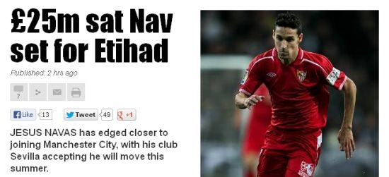 从本赛季的情况来看,曼城的确需要球员在边路有一定的作为。西班牙媒体同时报道了此事,《阿斯报》称,佩莱格里尼入主曼城之后的首签将会是纳瓦斯,双方已经就转会事宜达成了协议,塞维利亚2500英镑的标价已经得到曼城方面的同意。尽管西甲豪门皇马一支对这名边路好手觊觎已久,但是据纳瓦斯本人所说,他更愿意加入曼城。“曼城是一家我很欣赏的俱乐部,我愿意加入他们。”而据《每日邮报》报道,曼城为纳瓦斯开出的转会费是1800万英镑,而《太阳报》与西媒《阿斯报》的观点一致,认定这一数字在2500万英镑上下。
