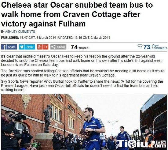 这场西伦敦德比,奥斯卡踢了78分钟,过去几周他因为脚踝受伤表现一直不佳,本场他终于有所起色。《每日邮报》分析指出,对于奥斯卡选择步行回家的做法,穆里尼奥或许不会高兴,因为他在近期曾指出,奥斯卡身体十分疲惫,这也影响了他的状态。