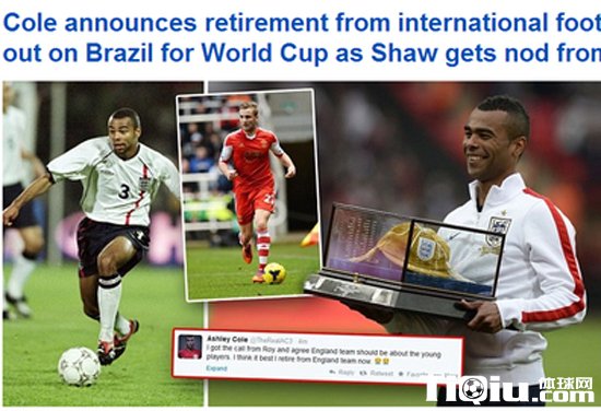 国际足球 时间:2014-05-12 15:33来源:未知编辑:小麦乱来【导读】英超在北京时间5月11日晚落下了帷幕,英格兰主帅霍奇森证实,老将阿什利科尔无缘巴西世界杯大名单,而知道消息后这名英格兰老将也随即通过个人推特宣布推出了英格兰国家队。