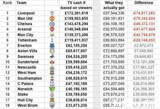 根据数据来看,实行了转播分成的“均富政策”后,曼联、切尔西、利物浦、阿森纳、曼城等几家明显收入变少了,他们足足少挣了2.82亿磅。