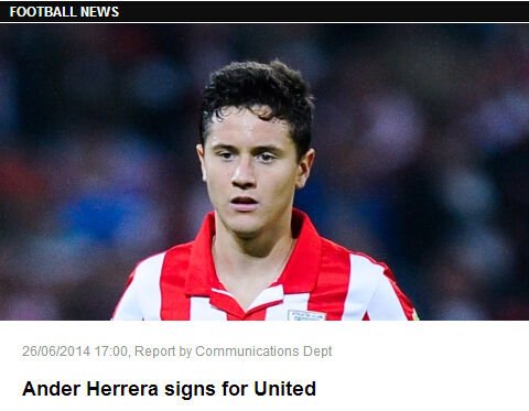 国际足球 时间:2014-06-27 13:53来源:未知编辑:ice【导读】6月27日凌晨,英超曼联官方宣布今年夏季第一签,签下的是西班牙中场安德尔-埃雷拉前毕尔巴鄂竞技球员,这份合约将确定埃雷拉与曼联的合作关系至少将持续4年。曼联对签下这样一位年轻出色的球员表示高兴。