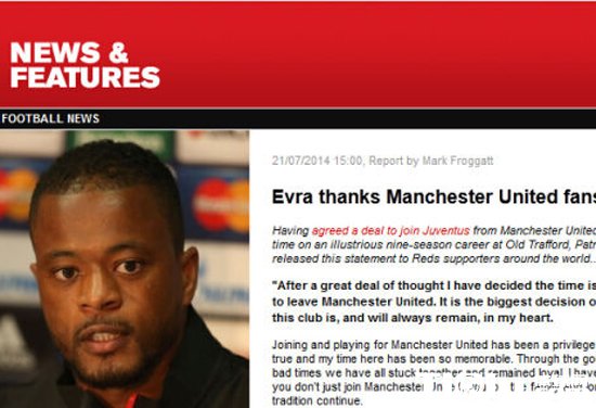 国际足球 时间:2014-07-22 15:04来源:未知编辑:小麦乱来【导读】北京时间7月21日,曼联官网宣布了埃弗拉离队的消息,同时,尤文图斯也宣布了签约埃弗拉成功,下赛季埃弗拉将转战意甲。在老特拉福德经历了9个辉煌的赛季后,这名法国后卫最终还是离开了,埃弗拉也第一时间发表了感谢信,向球迷们道别。