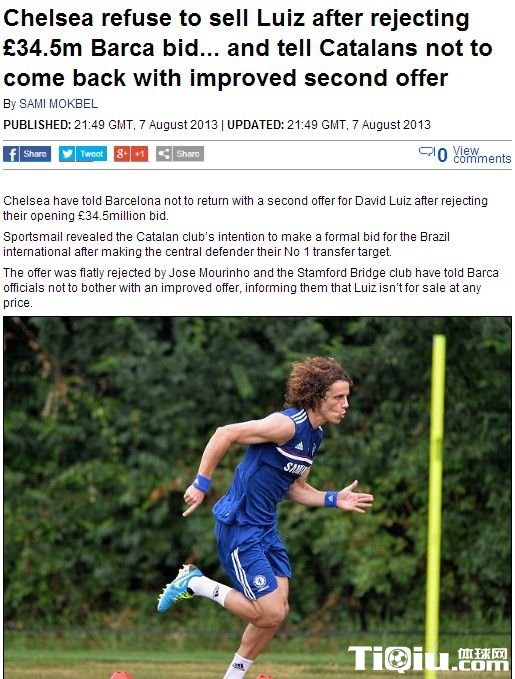 国际足球 时间:2013-08-09 09:53来源:http://gjzq.tiqiu.com编辑:小伍哥【导读】切尔西球员大卫·路易斯如今又被巴萨盯上。《邮报》披露,这支西班牙豪门在周二正式报价3450万求购这名巴西中卫,但却被切尔西一口拒绝,并且劝告巴萨不要再来报价,因为再高的价钱切尔西都不卖。