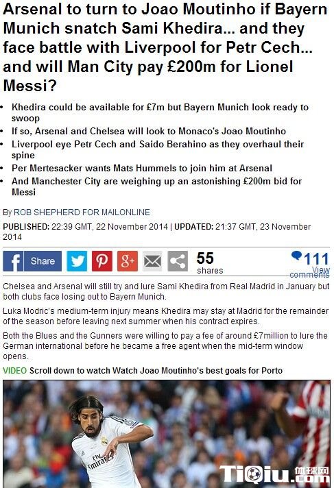 国际足球 时间:2014-11-25 11:08来源:未知编辑:小北【导读】北京时间2014年11月25日消息,上轮联赛主场负于曼联的阿森纳已经跌出前四,主帅温格因战绩不佳饱受批评,意识到问题严重性的温格已经拟定冬窗引援计划。据《每日邮报》透露,皇马后腰赫迪拉是教授冬购首选,若未能网罗,他会力争买来葡萄牙国脚穆蒂尼奥。