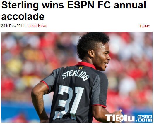 国际足球 时间:2014-12-30 10:24来源:未知编辑:小北【导读】北京时间2014年12月30日消息,利物浦官方宣布,球队红星斯特林近日斩获了ESPN评选的2014足坛年度最快进步奖,这名20岁小将此前刚刚收获了今年的欧洲金童奖,连续加冕两大殊荣,斯特林的2014年足够闪耀。