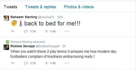 萨维奇的这番言论引起了热议,而利物浦飞翼斯特林似乎对此极度不满,因为在前不久,斯特林因为身体过度疲劳向霍奇森告假,进而缺席了一场欧洲杯预选赛,而这曾经在英格兰足坛引起轩然大波,因此,萨维奇的言论很容易让人想起斯特林。对此,斯特林在推特上回击道,“给我上床睡觉去。”