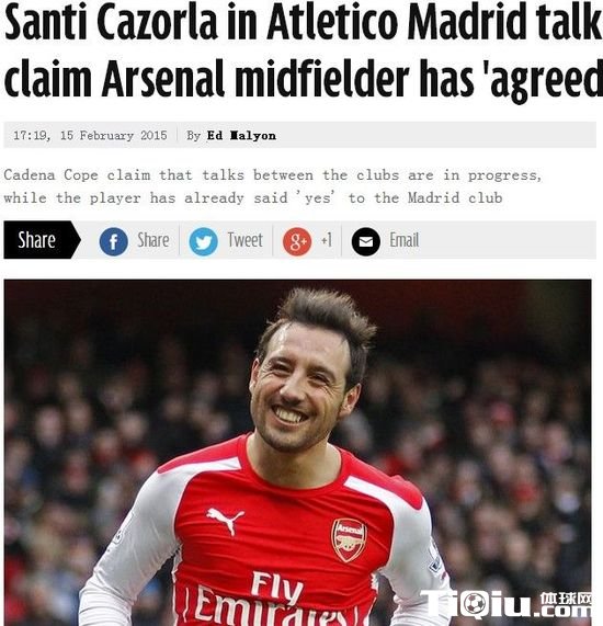 国际足球 时间:2015-02-23 14:51来源:未知编辑:小北【导读】据英国媒体《每日镜报》的消息,阿森纳队的西班牙中场卡索拉已经与西甲卫冕冠军马德里竞技队达成了加盟的协议,这位小个子中场将会在今年夏天离开枪手转投床单军团。