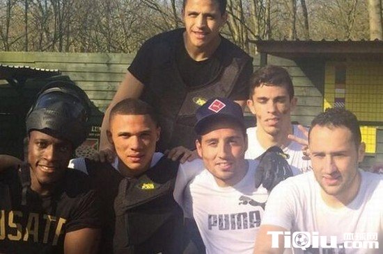 战绩的提升让阿森纳的球员们心情非常不错,近日,吉布斯、桑切斯、卡索拉、加布里埃尔、奥斯皮纳和维尔贝克6人饶有兴致的来到户外进行了一场真人CS。吉布斯在社交网站上上传了6人野战的照片,而他同时附上文字,“在彩弹射击战中被射爆了!”另外,阿森纳左后卫还附加了一个伤心的脸照,而看起来,他在这次野战中是失败一方。