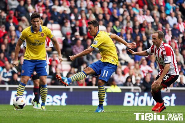 国际足球 时间:2013-09-16 10:06来源:http://gjzq.tiqiu.com编辑:小伍哥【导读】北京时间9月14日22时,英超第4轮阿森纳做客光明主场挑战“黑猫”桑德兰,枪手3-1战胜主队豪取联赛三连胜,并凭借着净胜球优势暂居积分榜首位。顶着4250万英镑身价厄齐尔在万众瞩目之下也迎来自己英超的首秀,德国人仅仅只用10分钟就征服英超球迷的心,正是厄齐尔助攻吉鲁为阿森纳首开纪录,上半场多次传出好球,只怪队友射术不精,浪费良机。