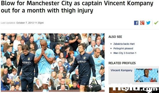 国际足球 时间:2013-10-08 15:42来源:http://gjzq.tiqiu.com编辑:小伍哥【导读】本赛季曼城状态起伏不定,很大原因是跟队长孔帕尼的伤病有关,比利时人康复还没几轮又倒下,这对于志在夺冠的蓝月亮是大大的打击,据权威的天空体育披露,因为在曼城3-1击败埃弗顿的比赛中大腿受伤,曼城队长孔帕尼将会缺阵4周。