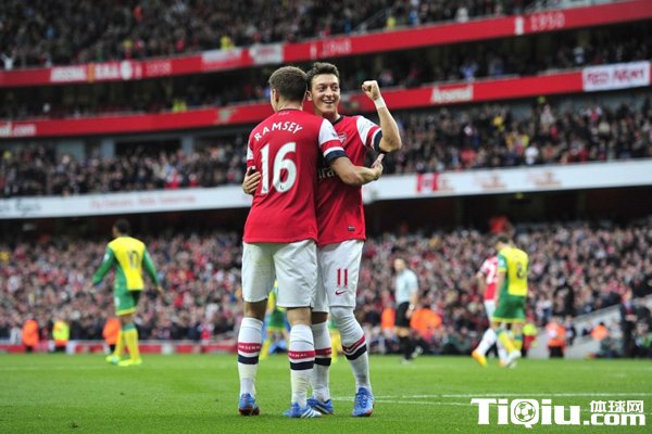 国际足球 时间:2013-10-21 09:51来源:http://gjzq.tiqiu.com编辑:小伍哥【导读】北京时间10月19日22时,2013-14英超第8轮阿森纳坐镇酋长球场迎来诺维奇的挑战。上半场枪手禁区前巧妙配合,吉鲁挑传威尔希尔首开纪录。下半场厄齐尔又接到吉鲁的传球头球破门扩大比分,之后诺维奇的豪森远射扳回一球。拉姆塞终场前依靠个人能力在禁区内晃倒多名防守球员破门锁定胜局,厄齐尔梅开二度为阿森纳锦上添花。最终主场4-1大胜金丝雀诺维奇继续领跑英超。