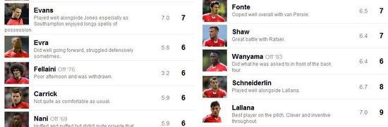 国际足球 时间:2013-10-21 14:25来源:http://gjzq.tiqiu.com编辑:小伍哥【导读】曼联又没能在主场带走胜利,在最后时刻被南安普敦逼平,要知道逆转原本是曼联的拿手好戏。面对一场令人失望的平局,英国球迷显然已经失去耐心,赛后新援费莱尼得到了他们打出的超低分数——3.2分,跟媒体的6分有这天壤之别。