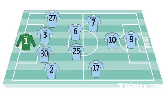 中场:德布劳内、博格巴、费尔南迪尼奥、斯特林