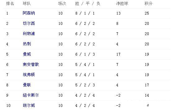 国际足球 时间:2013-11-04 13:14来源:http://gjzq.tiqiu.com编辑:小伍哥【导读】2013-14赛季英超第10轮全面战罢,阿森纳继续高歌猛进,主场2-0利物浦赢得巅峰对决。而近来势头凶猛的切尔西则客场0-2完败于纽卡,差点让出第二位置,幸好热刺跟埃弗顿互交白卷,而曼彻斯特双雄都取得大胜。