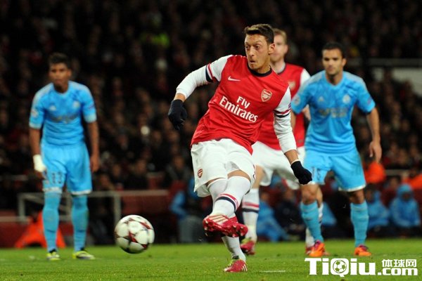 第37分钟,拉姆塞禁区左肋跳球转身过人时被恩库鲁放倒,阿森纳获得点球机会,慢镜头回放这个点球值得商榷,而厄齐尔主罚的点球质量不高,被马赛门将曼丹达将球封出,有意思的是,这也是枪手在欧冠历史上第8次射失点球,追平巴萨和皇马成为欧冠历史第一。赛后温格开玩笑说:“对英格兰队这可能是好消息吧,每个球员都可能罚丢。”
