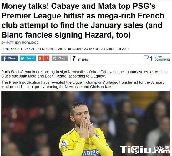 国际足球 时间:2013-12-25 14:49来源:http://gjzq.tiqiu.com编辑:小伍哥【导读】今年夏天,法甲土豪巴黎圣日耳曼高价引入意甲射手王卡瓦尼,球队的实力再上一步台阶,不过他们早已不满足称霸联赛,希望能像切尔西那样在欧冠有所作为,为此冬季转会期不吝啬金钱,有意强挖英超豪门墙角,纽卡斯尔中场卡巴耶以及切尔西双星马塔和阿扎尔均上了大巴黎的采购清单。